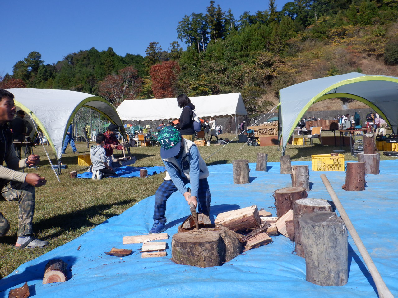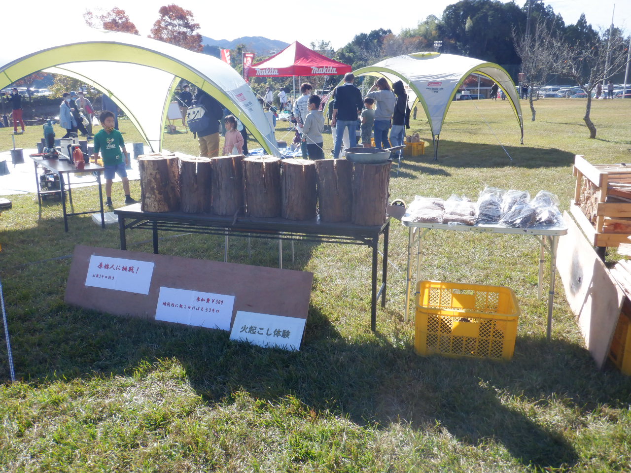 私達のブースでは 薪割り体験、バッテリーチェーンソー体験、目立て体験、火おこし体験、等の
